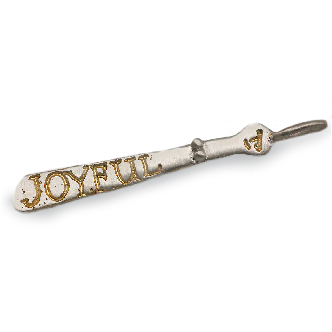 This silver sibyl pendant is etched with the word 'JOYFUL' and plated with a rich 22ct yellow gold. Made from recycled sterling silver and given a satin finish.