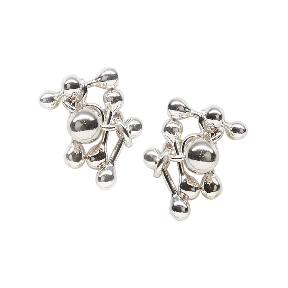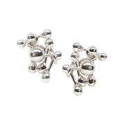 Silver studs of molecule droplets moves around a larger, central molecule. These studs offer a contemporary alternative to the standard silver stud.