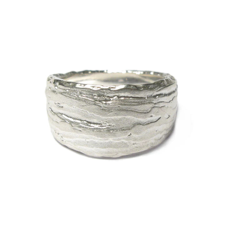 From the 'strata' collection, this wide tapered ring has an etched textured finish. Available to order in silver or oxidised silver. The available ring is in silver.