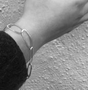 The SUPER NOVA Bracelet’s unique design brings subtlety and wit to the simple chain form: each link is hammered shiny on one side, with a soft-textured satin finish on the other, making a regular, easy-lying chain that twinkles luxuriantly in the light. It is worth noting that the Supernova Necklace (LN569) can be attached to this bracelet to make a longer necklace.